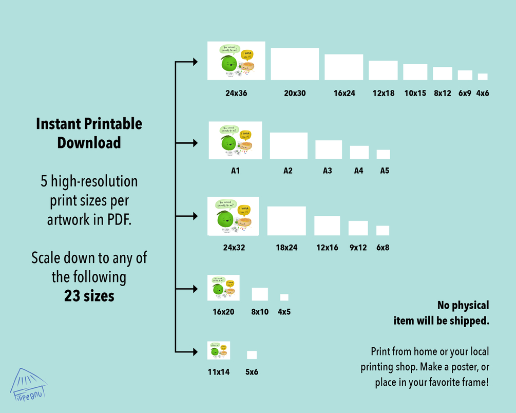 DOWNLOAD INCLUDES 5 large high-resolution print sizes in PDF. You can then scale these down to any of the following 23 sizes: