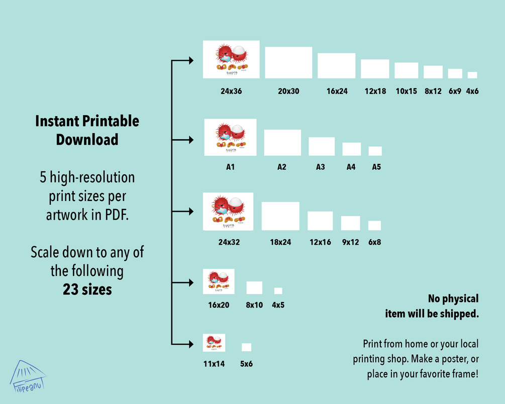 DOWNLOAD INCLUDES 5 large high-resolution print sizes in PDF. You can then scale these down to any of the following 23 sizes: